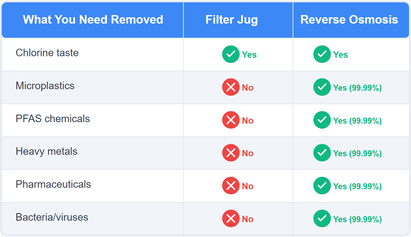 Microplastics, PFAS, heavy metals, pharmaceuticals, bacteria, viruses—everything filter jugs miss.